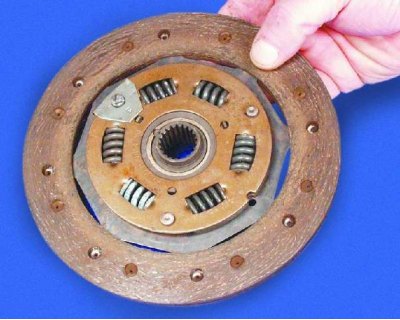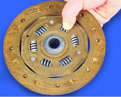 4. Проверьте надежность фиксации демпферных пружин в гнездах ступицы ведомого диска. Если пружины сломаны, диск надо заменить. Если при визуальном осмотре обнаружено коробление диска, проверьте его биение. Если величина биения превышает 0,5 мм, замените диск.