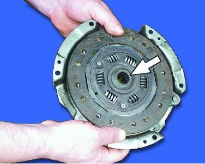 7. Установите ведомый диск в кожух нажимного диска так, чтобы менее выступающая часть ступицы была направлена в сторону маховика.
