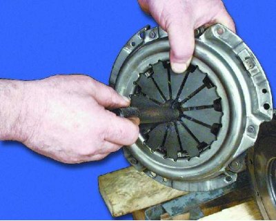8. Вставьте центрирующую оправку в шлицы ведомого диска со стороны диафрагменной пружины.