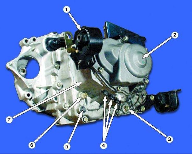 Коробка передач (вид слева): 1 - левая опора силового агрегата; 2 - задняя крышка картера коробки передач; 3 - сливная пробка; 4 - пробки фиксаторов передач; 5 - пробка фиксатора передачи заднего хода; 6 - выключатель света заднего хода; 7 - картер коробки передач