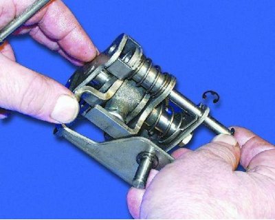 1. Для замены рычагов и пружин механизма переключения передач снимите стопорное кольцо с направляющей оси блокировочных скоб.