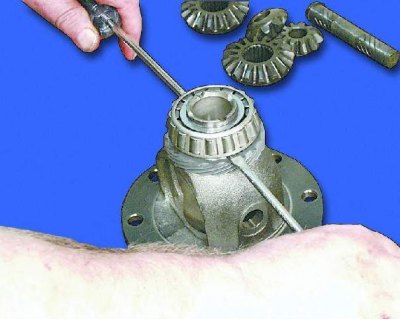 - Если нужно заменить шестерню привода спидометра, то можно спрессовать подшипник, не разрушив его, с помощью двух отверток, прикладывая усилие к внутреннему кольцу подшипника. Шестерня при этом разрушится, но ее все равно надо менять.