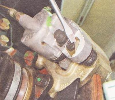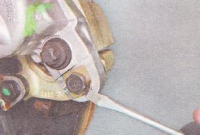 6. При помощи большой шлицевой отвертки и молотка, отгибаем на тормозном цилиндре угол стопорной пластины болта нижнего направляющего пальца.