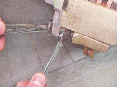 8. Удерживая от вращения направляющий палец рожковым ключом на 17 мм, ключом на 13 мм отворачиваем его болт.