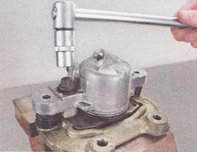 2. Закрепляем тормозной суппорт в тисках и отворачиваем болты направляющих пальцев (см. п. 6-8 "Передние тормозные колодки - замена").