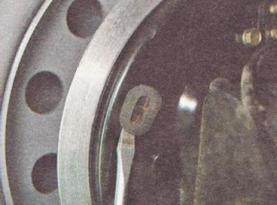 2. Шлицевой отверткой извлекаем резиновую заглушку смотрового отверстия в щите тормозного механизма заднего колеса.
