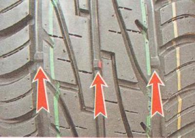 2. Визуально определяем возможность дальнейшей эксплуатации шины по индикаторным выступам в канавках рисунка протектора.