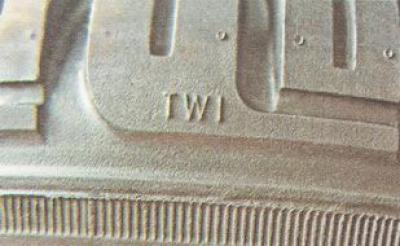 3. Индикаторы расположены по всей окружности шины на некотором расстоянии друг от друга. Находим их по условным обозначениям в виде букв «TWI» или стрелкам «вверх» на боковине шины.
