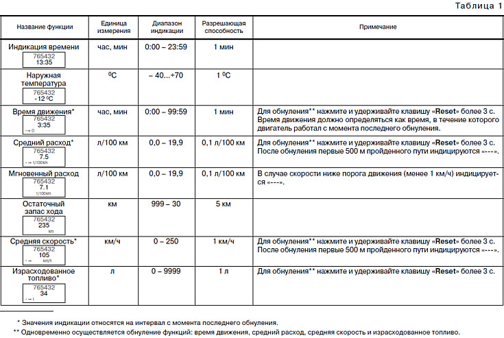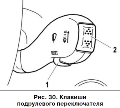 На нижней строке индицируется время, наружная температура или функции бортового компьютера (по выбору). Для переключения между режимами индикации и управления функциями используются клавиши подрулевого переключателя стеклоочистителей: