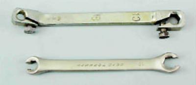 4. Двухсторонние ключи для штуцеров тормозной системы на 8 и 10 мм. Наиболее распространены два типа таких ключей: зажимной ключ и накидной ключ с прорезью. Зажимной ключ позволяет отворачивать штуцеры с изношенными гранями. Для того, чтобы надеть ключ на штуцер тормозной трубки необходимо вывернуть стяжной болт. Накидной ключ с прорезью позволяет более оперативно выполнять работу, однако такой ключ должен быть изготовлен из качественной стали с соответствующей термической обработкой.