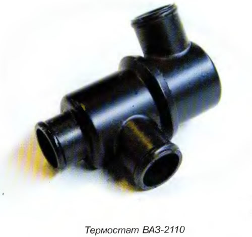 Термостат с индексом 2110 внешне напоминает больше термостат 2101, так как не имеет дополнительного воздушного тонкого патрубка. Воздух поступает в систему от тройника, который находится рядом с термостатом. Этот термостат показан на цветной вклейке.