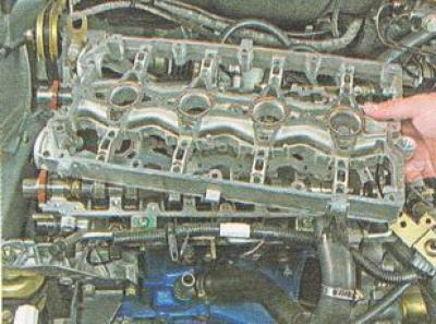 Примечание. На двигателе ВАЗ 2112 (1,5i) корпус подшипников распредвалов снимаем вместе с направляющими трубами свечей (свечными колодцами). Извлекаем трубы из корпуса подшипников распредвалов.