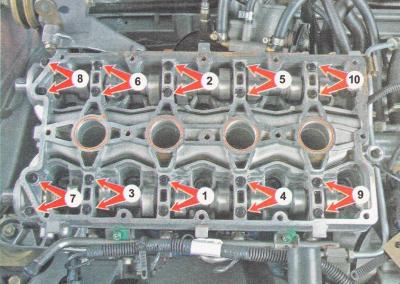 5. Устанавливаем корпус подшипников на головку блока цилиндров и равномерно затягиваем болты его крепления до соприкосновения корпуса подшипников с головкой блока. Окончательно затягиваем болты крепления корпуса подшипников попарно, моментом 8,0-10,0 Н·м (0,8-1,0 кгс·м) в последовательности, изображенной на фото (см. ниже).