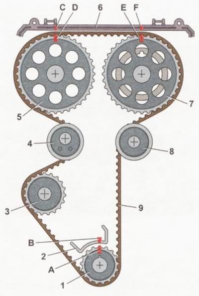 Схема привода распредвалов на автомобилях ВАЗ 2110, ВАЗ 2111, ВАЗ 2112: 1 - зубчатый шкив коленвала двигателя; 2 - прилив на крышке масляного насоса; 3 - зубчатый шкив насоса охлаждающей жидкости; 4 - натяжной ролик; 5 - зубчатый шкив распредвала выпускных клапанов; 6 - задняя крышка ремня; 7 - зубчатый шкив распредвала впускных клапанов; 8 - направляющий ролик; 9 - зубчатый ремень; А - метка ВМТ на зубчатом шкиве коленвала; В - метка на крышке масляного насоса; С, F - метка на задней крышке; D - метка на зубчатом шкиве распредвала выпускных клапанов; Е - метка на зубчатом шкиве распредвала впускных клапанов