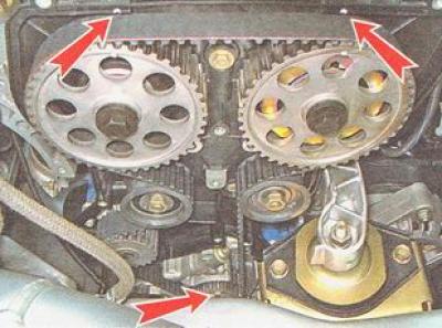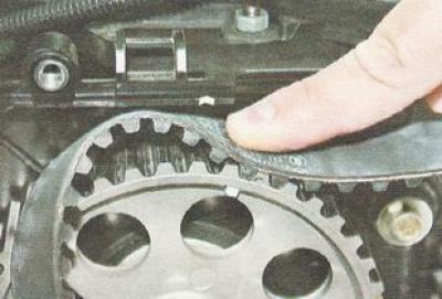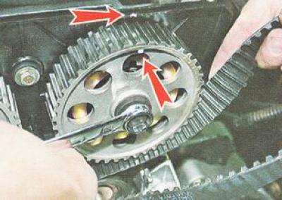 Примечание. Если есть приспособление для фиксации шкивов распределительных валов - устанавливаем его и надеваем ремень ГРМ на шкивы, не допуская провисания его правой ветви и участка между шкивами распределительных валов. Если приспособления нет, следует учитывать, что после снятия зубчатого ремня ГРМ шкив распределительного вала впускных клапанов под действием их пружин повернется на один зуб по часовой стрелке, а выпускных - против часовой стрелки.