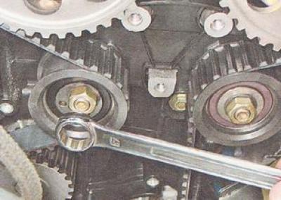Примечание. Для снятия ремня газораспределительного механизма достаточно отвернуть гайку натяжного ролика на несколько оборотов и ослабить натяжение ремня. Однако снимать и надевать ремень газораспределительного механизма на шкивы удобнее, когда натяжной и направляющий ролики свободно двигаются на шпильках.