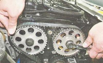 5. Поворачивая шкивы ключом на 17 мм, натягиваем правую ветвь ремня ГРМ, не допуская поворачивания шкива коленвала и полностью одеваем ремень ГРМ на шкив распредвала выпускных клапанов.