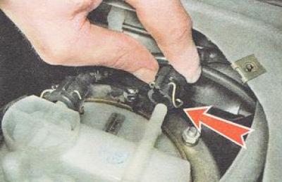 4. Нажав на пружинный фиксатор, отсоединяем наконечник трубки топливопровода от выходного (нагнетающего) патрубка топливного модуля бензонасоса.