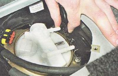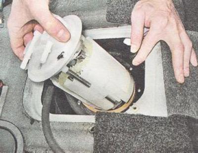 Предупреждение. Снимая топливный модуль, не погните рычаг датчика указателя уровня топлива. Для этого слегка наклоните модуль бензонасоса и аккуратно выведите поплавок из отверстия топливного бака.