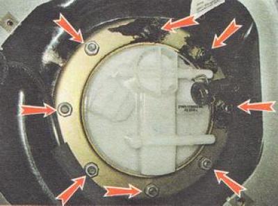 6. Торцовым ключом на 10 мм отворачиваем восемь гаек крепления прижимного кольца топливного модуля. Под гайками установлены пружинные шайбы.
