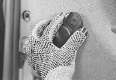 8. Шлицевой отверткой с широким лезвием (подложив под нее ткань, сложенную в несколько слоев) отжимаем обивку от двери. При этом извлекаем восемь держателей крепления обивки из отверстий двери (см. "Обивка передней двери - снятие и установка").