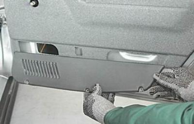 9. Слегка приподнимаем обивку и снимаем ее с двери.