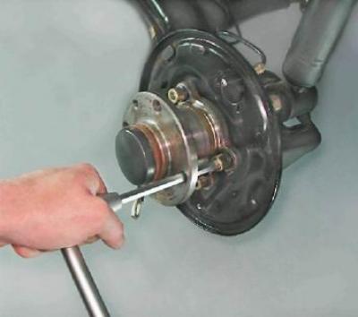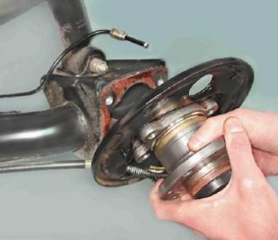 3. Пропуская трос стояночного тормоза через отверстие в опорном щите, снимаем ступицу в сборе со щитом.