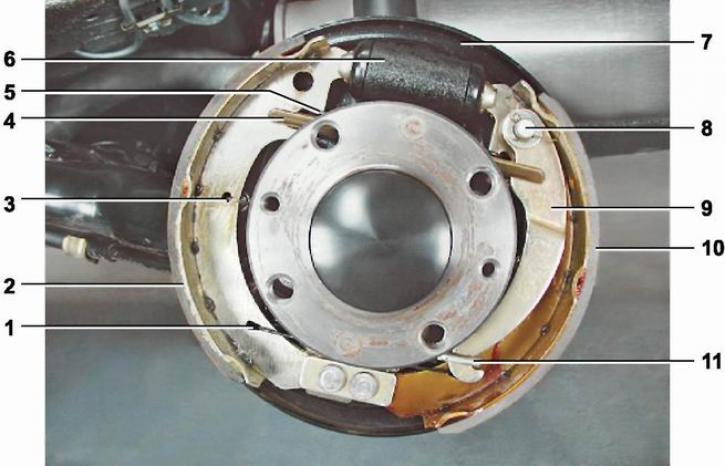 Тормозной механизм заднего колеса: 1 - нижняя стяжная пружина колодок; 2 - передняя тормозная колодка; 3 - прижимная пружина передней колодки; 4 - распорная планка; 5 - верхняя стяжная пружина; 6 - рабочий тормозной цилиндр; 7 - щит тормозного механизма; 8 - осевой палец распорного рычага; 9 - распорный рычаг; 10 - задняя тормозная колодка; 11 - наконечник троса стояночного тормоза