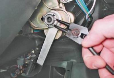 3. При помощи разжимных щипцов снимаем стопорное кольцо болта механизма регулировки наклона рулевой колонки.