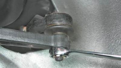 3. Накидным ключом на 13 мм ослабляем затяжку стяжного болта наружного наконечника рулевой тяги.