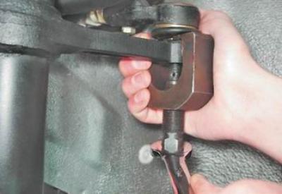 6. Съемником выпрессовываем палец из отверстия поворотного рычага стойки передней подвески.