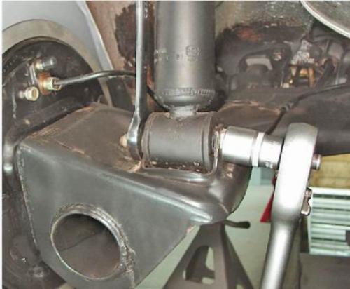 5. Двумя ключами на 19 мм отворачиваем гайку болта крепления нижнего конца амортизатора к балке заднего моста и вынимаем болт.