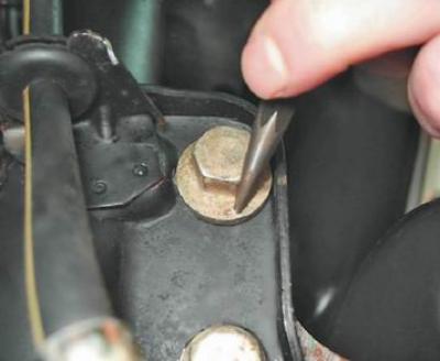 5. Чтобы минимизировать нарушение регулировки развала колеса, керном или краской наносим метки на верхний болт крепления поворотного кулака и кронштейн стойки.