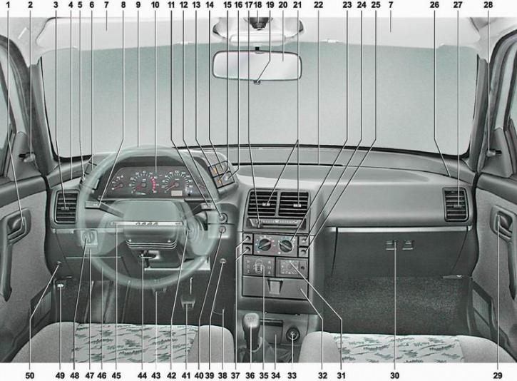 1, 29 - внутренняя ручка открывания двери; 2, 28 - рукоятка регулировки наружного зеркала заднего вида; 3, 27 - боковые вентиляционные решетки; 4, 26 - вентиляционные решетки обдува стекол дверей; 5 - клавиша выключателя наружного освещения; 6 - заглушка; 7 - солнцезащитный козырек; 8 - рычаг левого подрулевого переключателя; 9 - рулевое колесо; 10 - щиток приборов; 11 - рычаг правого подрулевого переключателя; 12 - ручка регулятора подсветки приборов; 13 - контрольная лампа включения задних противотуманных фонарей; 14 - клавиша выключателя задних противотуманных фонарей; 15 - контрольная лампа включения обогрева заднего стекла; 16 - клавиша выключателя обогрева заднего стекла; 17 - рычаг управления заслонками воздухораспределителя; 18 - фонарь индивидуального освещения; 19 - клавиша управления зеркалом заднего вида (переключатель "день-ночь"); 20 внутрисалонное зеркало заднего вида; 21 - центральные вентиляционные решетки; 22 - вентиляционная решетка обдува ветрового стекла; 23 - блок управления отопителем; 24 - кнопка выключателя аварийной сигнализации; 25, 37 - заглушки; 30 - крышка вещевого ящика; 31 - часы; 32 - крышка ниши; 33 - прикуриватель; 34 крышка пепельницы; 35 - блок индикации бортовой системы контроля; 36 рычаг переключения передач; 38 - педаль "газа"; 39 - розетка для подключения переносной лампы; 40 - датчик иммобилайзера с индикатором; 41 - педаль тормоза; 42 - выключатель (замок) зажигания; 43 - педаль сцепления; 44 - рычаг механизма регулировки наклона рулевого вала; 45 - накладка рулевого колеса (кнопка звукового сигнала); 46 - крышка монтажного блока предохранителей и реле; 47 - кнопка открытия крышки монтажного блока предохранителей и реле; 48 - ручка управления гидрокорректором фар; 49 - рычаг привода замка капота; 50 - кнопка электропривода замка двери багажного отделения;