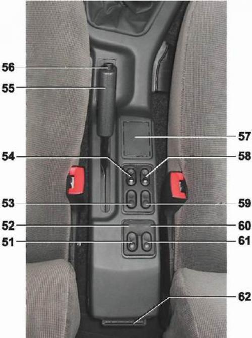 51 - клавиша выключателя обогрева переднего левого сиденья; 52 - контрольная лампа включения обогрева переднего левого сиденья; 53, 59 - заглушки (на части автомобилей на этих местах установлены выключатели стеклоподъемников задних дверей); 54 - клавиша выключателя стеклоподъемника передней левой двери; 55 - рычаг стояночного тормоза; 56 - кнопка рычага стояночного тормоза; 57 - место установки блока управления наружными зеркалами заднего вида; 58 - клавиша выключателя стеклоподъемника передней правой двери; 60 - контрольная лампа включения обогрева переднего правого сиденья; 61 - клавиша выключателя обогрева переднего правого сиденья; 62 - задняя пепельница
