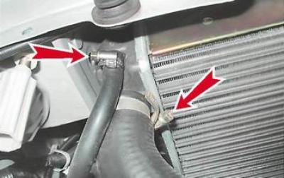 3. Отклонив радиатор назад, ослабляем затяжку хомутов, снимаем с патрубков радиатора пароотводящий шланг и шланг подвода охлаждающей жидкости.