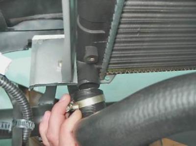 4. Ослабив затяжку хомута, снимаем с патрубка радиатора шланг отвода охлаждающей жидкости.