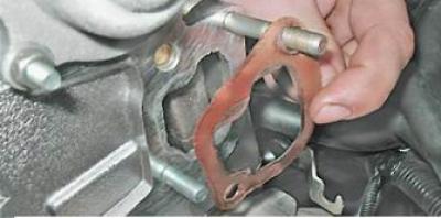 12. Снимаем корпус термостата со шпилек головки блока цилиндров и, не отсоединяя шлангов, отводим его в сторону.