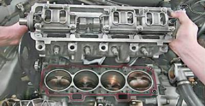 15. Немного оттянув в сторону заднюю крышку ремня привода ГРМ, снимаем головку блока цилиндров.