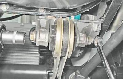 4. Двумя ключами на 15 мм отворачиваем гайку болта крепления штанги к двигателю.