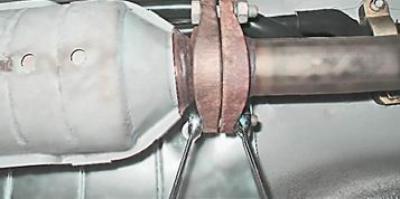 3. На двигателях 21114 и 21124 отсоединяем дополнительный глушитель от приемной трубы (см. "Металлографитовое уплотнительное кольцо - замена").