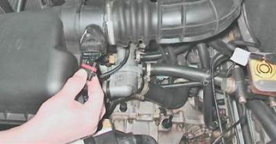 2. Нажимаем на фиксатор колодки и отсоединяем колодку жгута проводов от датчика массового расхода воздуха.