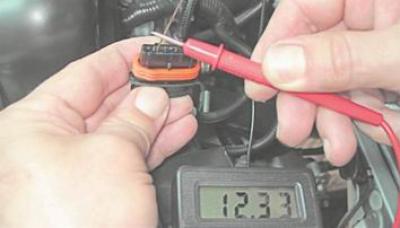 Замечание. Напряжение на выводе должно быть не меньше 12 В. Если напряжение не поступает на колодку или оно меньше 12 В, значит, разряжена аккумуляторная батарея, неисправна цепь питания или неисправен ЭБУ.