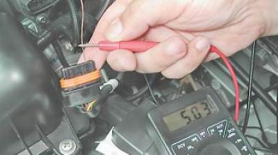 Замечание. Напряжение на выводе должно быть около 5 В. Если напряжение не соответствует норме, значит, неисправна цепь питания датчика или неисправен ЭБУ.