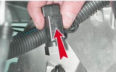 2. Нажав на пружинные фиксаторы, отсоединяем колодку жгута проводов от датчика скорости автомобиля.