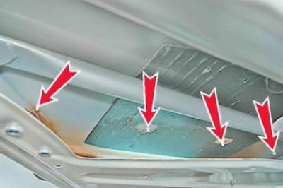 3. Плоскогубцами с узкими губками, сжимая усики четырех пластмассовых держателей, утапливаем их в отверстия (см. "Накладка переднего крыла - снятие и установка").