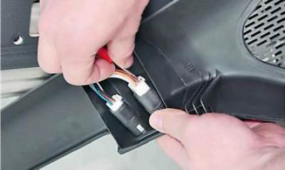 4. Отжав фиксаторы, отсоединяем две колодки жгута проводов от клавиш управления стеклоподъемниками.