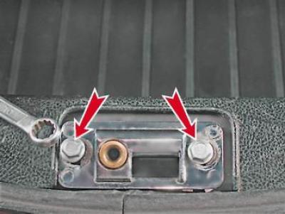3. Торцовым ключом на 10 мм отворачиваем две гайки крепления замка к двери багажного отделения и снимаем замок.