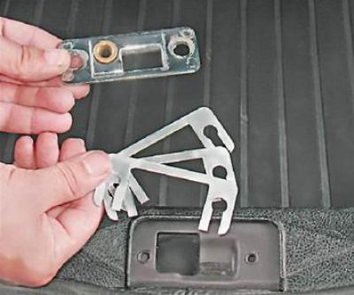 5. Если дверь багажного отделения закрывается неплотно ослабляем два болта крепления фиксатора замка и убираем одну или несколько регулировочных пластин.