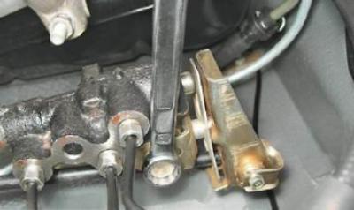5. Накидным ключом на 13 мм ослабляем затяжку болта переднего крепления регулятора давления к кронштейну.